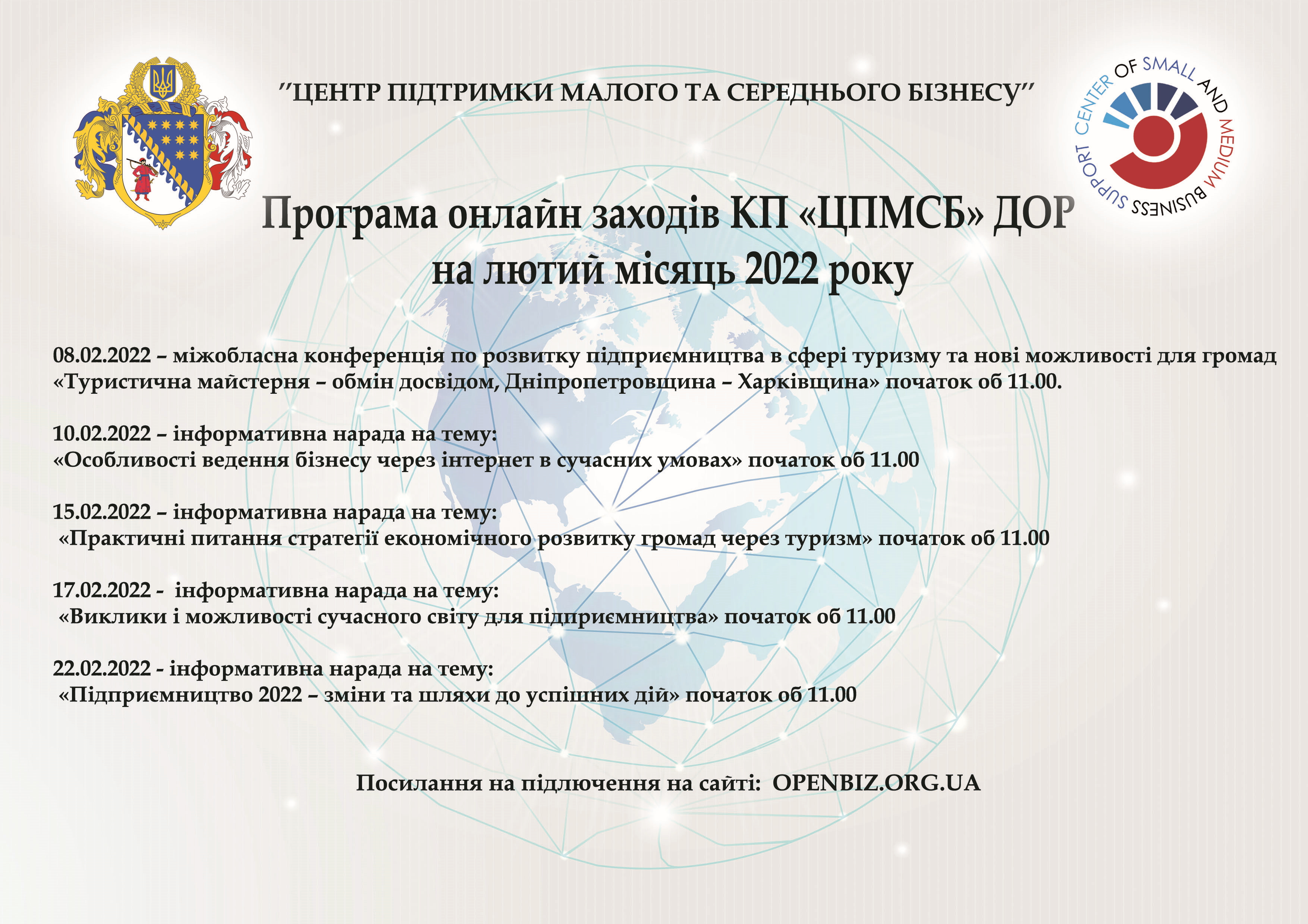 З метою інтенсифікації підприємницької діяльності серед громадян та підвищенню економічного стану в Дніпропетровській області, КП ЦПМСБ ДОР пропонує низку інформаційних онлайн заходів на лютий місяць 2022 року.